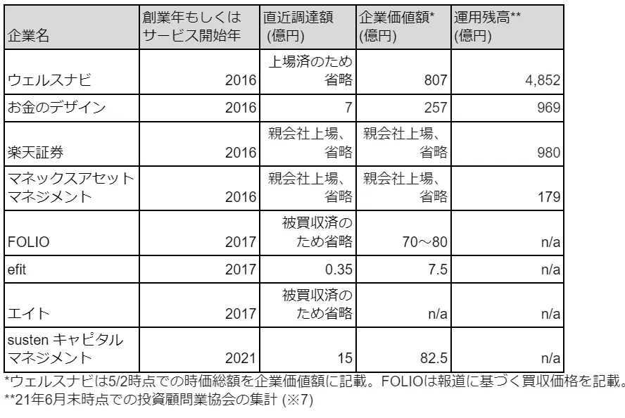 海外同様、既存金融機関がロボアドバイザーを買収する事例が見られる。FOLIOは2021年にSBIホールディングスに買収され、エイト証券は2018年に野村アセットマネジメントに買収された。
