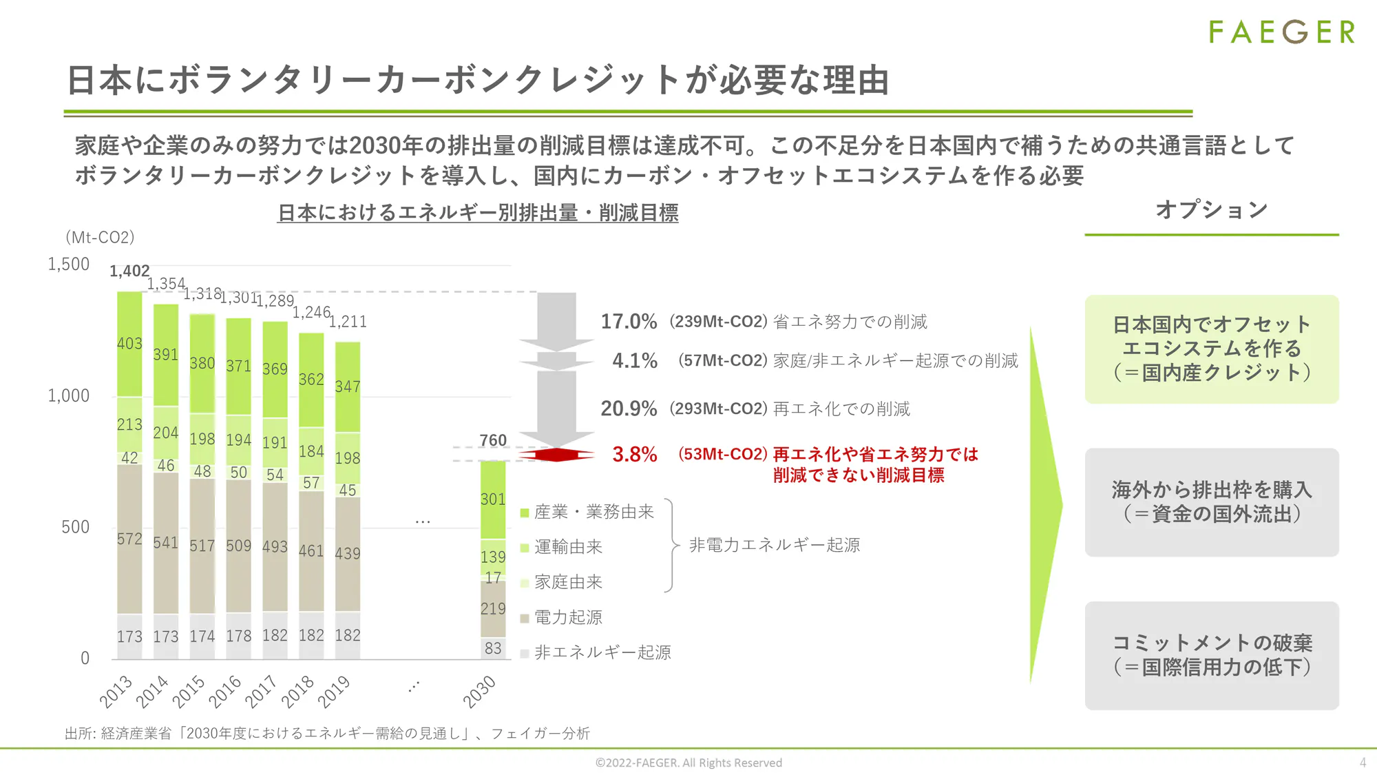 日本政府として掲げている目標なので、どうしても達成をしなければならない。海外企業からクレジットを購入する選択肢もありますが、それだけでは国外に通貨が流出してしまいます。また、クレジットを購入・利用するためのマーケットが整っていないため、大企業もクレジット購入の際にかなりの手間がかかっています。