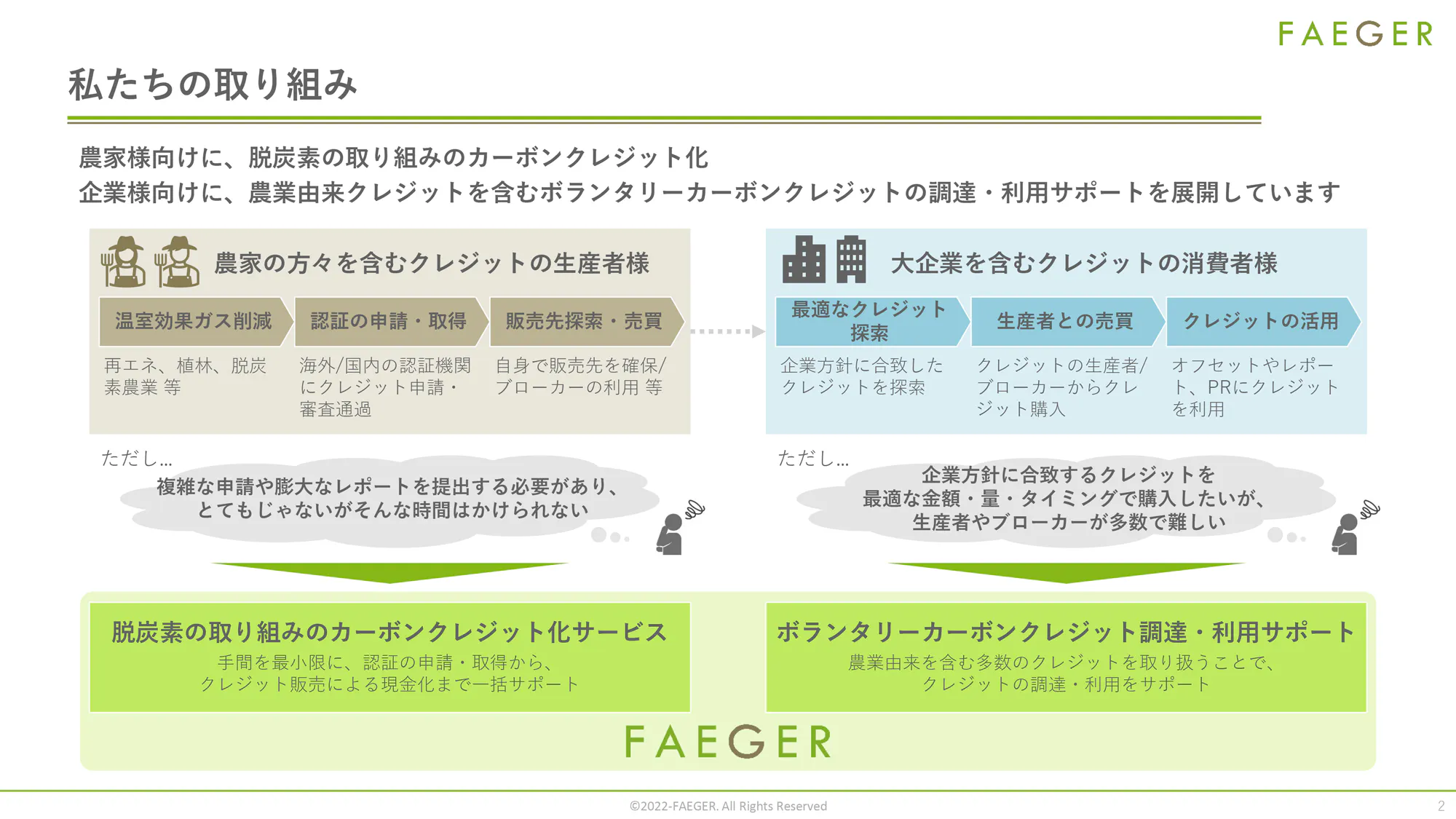 フェイガーは、農家向けの脱炭素に貢献する農法のカーボンクレジット化サービス、および企業向けにボランタリーカーボンクレジットの調達・利用サポートを行っている。