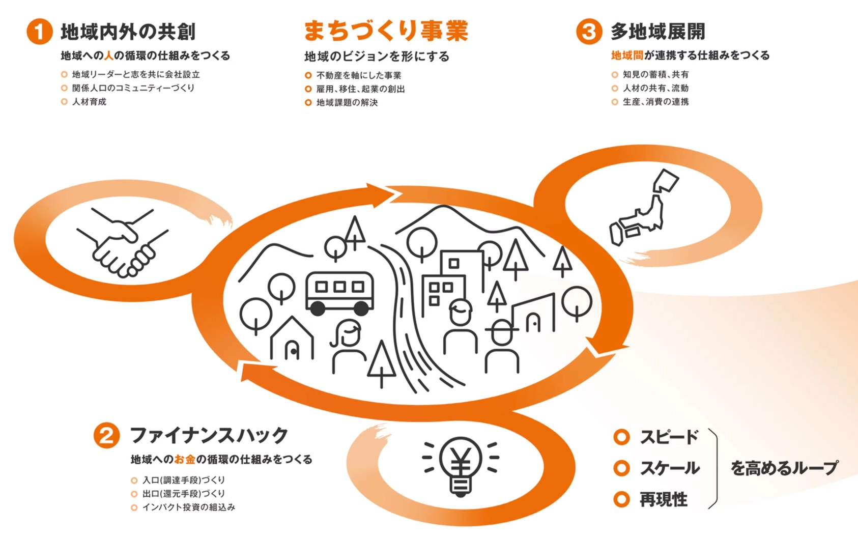 続く“金の循環”では、出資・融資・助成金といった多様な資金を組み合わせることで、プロジェクト単位で地域に経済的な還元がなされる仕組みを構築。金融機関や自治体、地域の出資者との連携が要となっています。