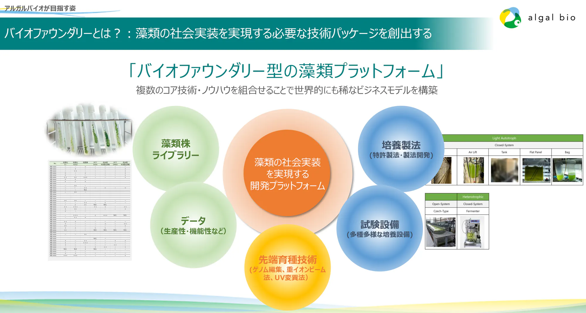 同社は、健康・食糧・環境といった産業領域の事業会社向けに、最適な技術を提供するバイオファウンダリー(※)型の藻類開発プラットフォームを構築している。