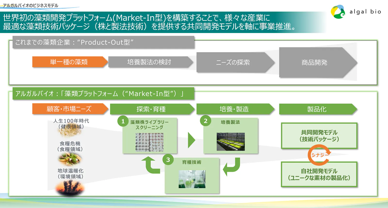 これまで藻類を利用した商品開発は、特定の種類を選びニーズを探求するプロダクトアウト型が主流だった。同社のビジネスモデルは、顧客や市場のニーズから最適な藻類を探索し、製品化していくマーケットイン型であるのが特徴だ。