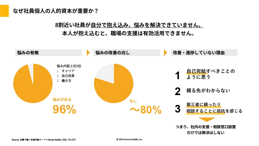 我々が実施した調査で、会社で働く人のほとんどが何らかの悩みを抱えているにもかかわらず、改善はされていないことがわかりました。悩みを抱え込んでしまう人が多く、単純に社内の相談窓口を設置するだけでは支援としては不十分なのです。