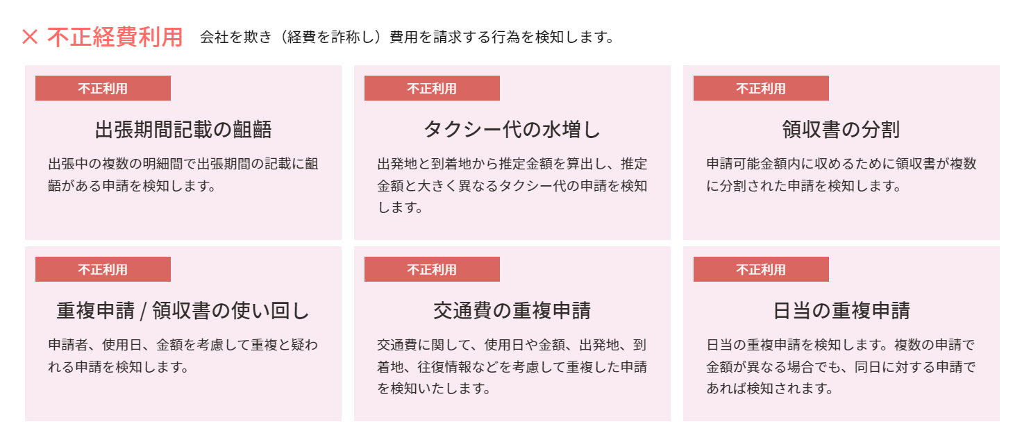 二重申請や水増し申請などの検出に加え、特定個人との多頻度利用など、異常な経費利用も検出可能だ。検知した不正経費は一覧で確認できる。申請を不正や異常と判断した根拠も可視化するため、差戻し対応や経費の見直しなど、経理担当者の負担軽減と企業ガバナンスの強化を両面で支援する。