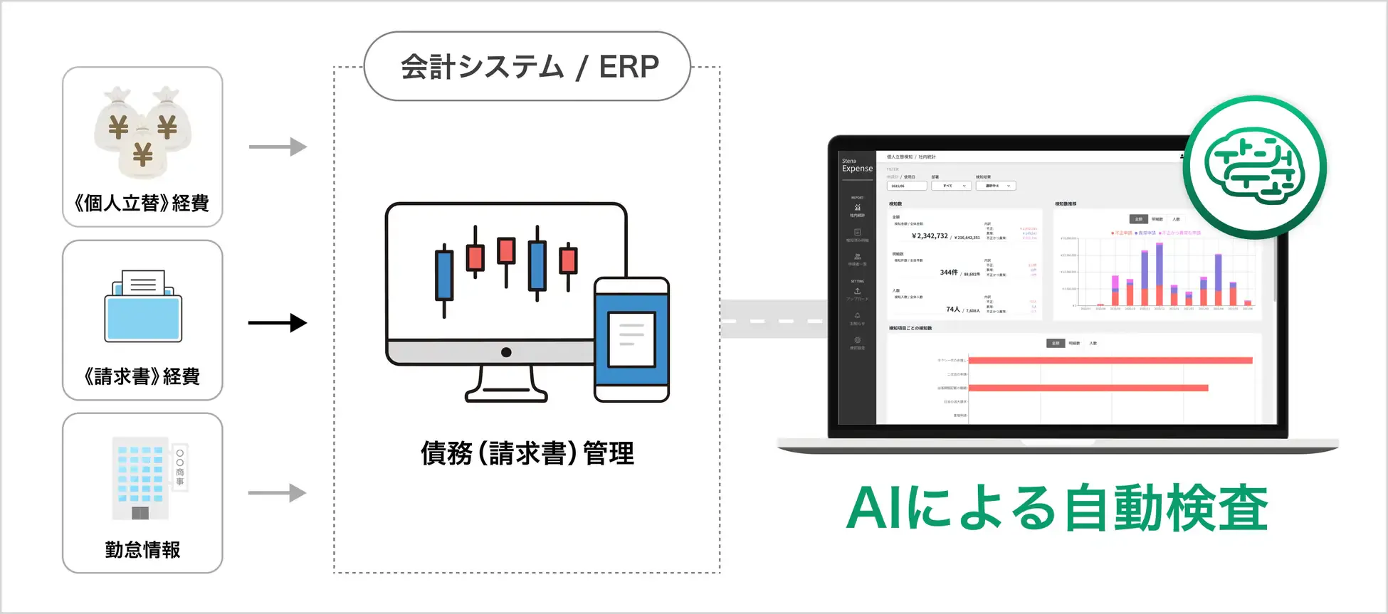 Stena Expenseは経費の不正や不備をAIで検査するサービス。経費精算に関する各種データをもとに異常な経費利用を洗い出す。