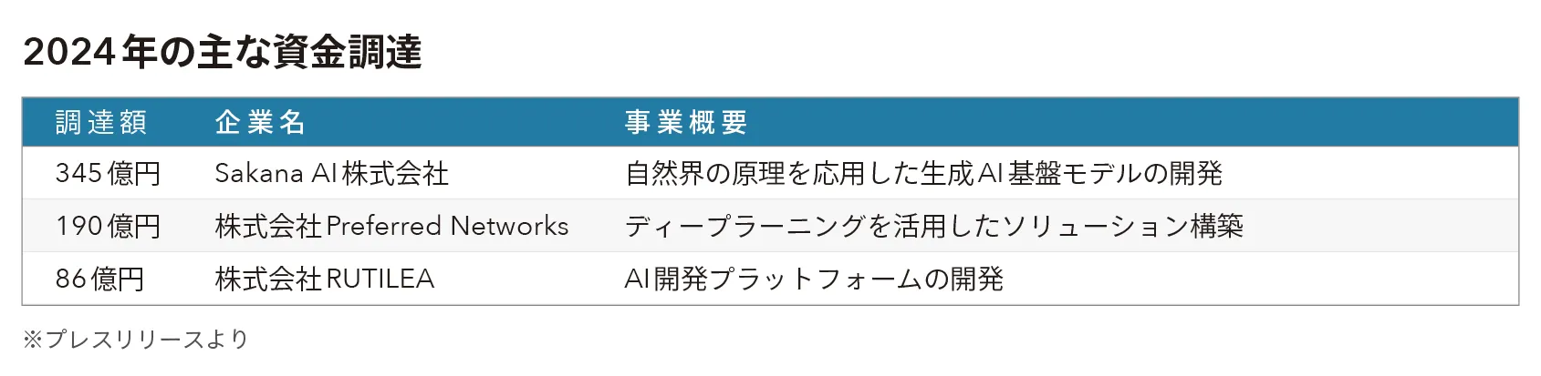 世界の生成AI市場規模は、2024年に360億ドルと推定され、2030年には約3560億ドル、CAGRは46.5%と驚異的な成長が予測されている※1。2024年はスタートアップ全体の調達件数が減少した中、AI分野では調達件数が増加しており、投資家の高い関心を集めている※2。アメリカのAnthropicが調達額10億ドル以上の超大型取引を行ったほか、中国のMoonshot AIや、インドのKrutrimなどの生成AIスタートアップが新たにユニコーン企業となった。※3。これらのスタートアップに加え、Google、Microsoftなどの大手企業も開発に参入しており、競争が激化している。