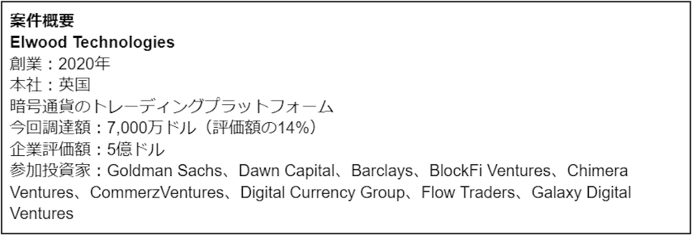 シリーズAの調達で調達額が大きかったのはElwood Technologiesです。同社は暗号通貨交換所や流動性プロバイダー、カストディアン等とAPIで連携し、大規模な取引が必要な機関投資家や法人に対応できるデジタル資産のトレーディングプラットフォームを開発・運営しています。同プラットフォームには注文実行管理システム、ポートフォリオ管理システム、マーケットのデータ・分析等が含まれます。本ラウンドにはGoldman SachsやBarclaysといった伝統的な金融業界と、BlockFi VenturesやChimera Venturesといったデジタル資産業界双方の投資家が参加しています。
