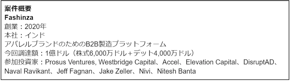 シリーズB1社目は、ファッション小売ブランド向けにデザインから納品まで、一貫した生産サポートを行う製造プラットフォームを運営・開発するFashinzaです。同社プラットフォーム上では、デザイン選択、記事調達、サプライヤー選択、クイックサンプリング、品質チェックなどが可能であり、さらにオーダー後は同社担当者による製造の管理、物流や支払いサポートまで提供しています。