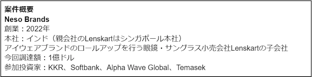 シードラウンドで1億ドルを調達したNeso Brandsは、先日1億ドルの調達を43億ドルの評価額で行った、オムニチャネルで眼鏡・サングラスを販売するシンガポールのユニコーン企業Lenskartのインドにおける子会社です。同社はアイウェアブランドのロールアップを進めています。