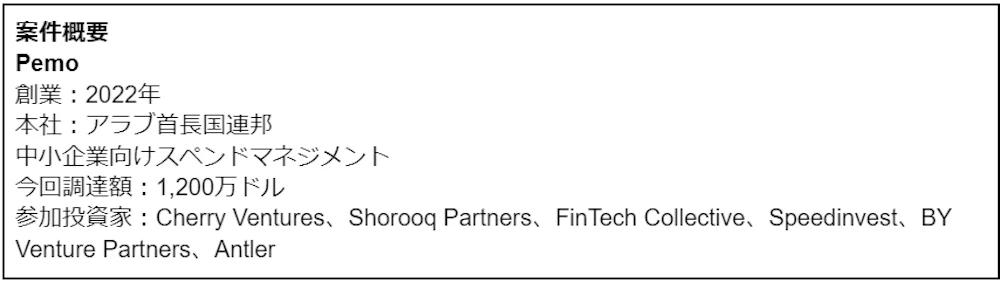 シードで1,200万ドルを調達したPemoは中東・北アフリカ・パキスタン地域で中小企業向けにスペンドマネジメントを展開する企業です。同社は法人用プリペイドカード、請求書支払いシステム、費用管理機能を一括で提供しています。IMFの2019年のレポート(※2)によると、同地域では中小企業が企業全体の96%を占めていますが、8割近くの企業が銀行のクレジットにアクセスできておらず、クレジットギャップの大きなマーケットとなっています。クレジットカードを持たない企業の支払い管理プロセスをデジタル化する役目をスペンドマネジメント企業が担っており、今年3月には同じくアラブ首長国連邦拠点とするPluto(600万ドル)やAlaan(250万ドル)もシードラウンドでの資金調達を行いました。
