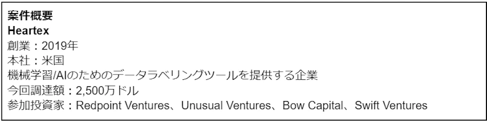 シリーズAで2,500万ドルを調達した企業は賃貸物件の小額投資を可能にするArrived Homesとデータラベリングツールを提供する企業Heartexです。今回はHeartexを取り上げます。