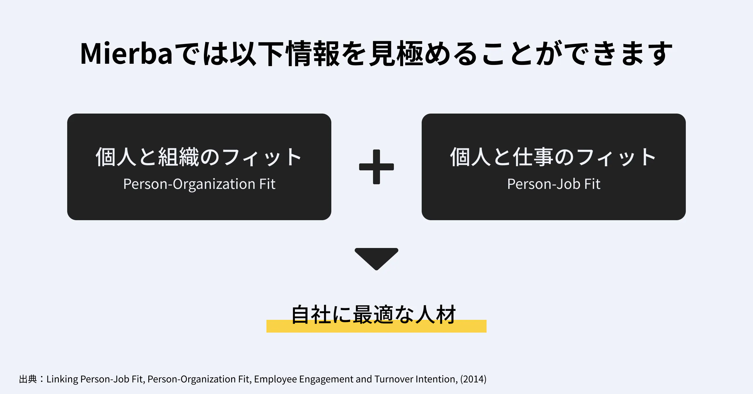 株式会社Mierbaは、候補者の職種別スキルチェックテスト『Mierba』を提供する企業。 『Mierba』は職種別の状況判断テストで候補者のスキルを可視化し、中途採用において自社に最適な人材を素早く特定することを実現させる。また、着実にテスト改善のPDCAを回すことで、自社の職種に合わせたテスト作成・選考基準の定量化に貢献する。