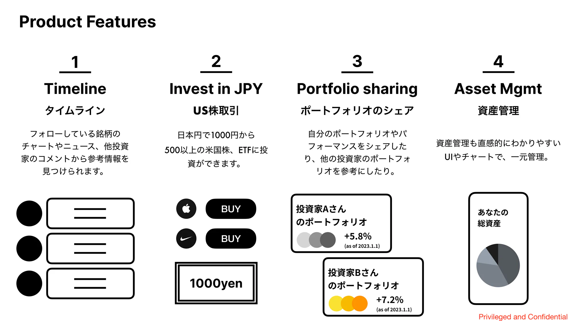 ブライアン氏:日本は投資に関して遅れています。コロナ禍を経て投資に興味を持つ人は増えているのですが、Z世代の若者が簡単に使えるプラットフォームが不足しています。今はTikTokやInstagramなど、ソーシャルメディアで情報を得る時代。ソーシャルの力を借りて、コンシューマーが気軽に使えるプラットフォームを作れば、課題解決のチャンスがあると思いました。ただ、リスクに対する不安は根強いです。そこで、1,000円という少額から始められて、米国ドルの為替取引は不要という方式のプラットフォームを提供することに決めました。