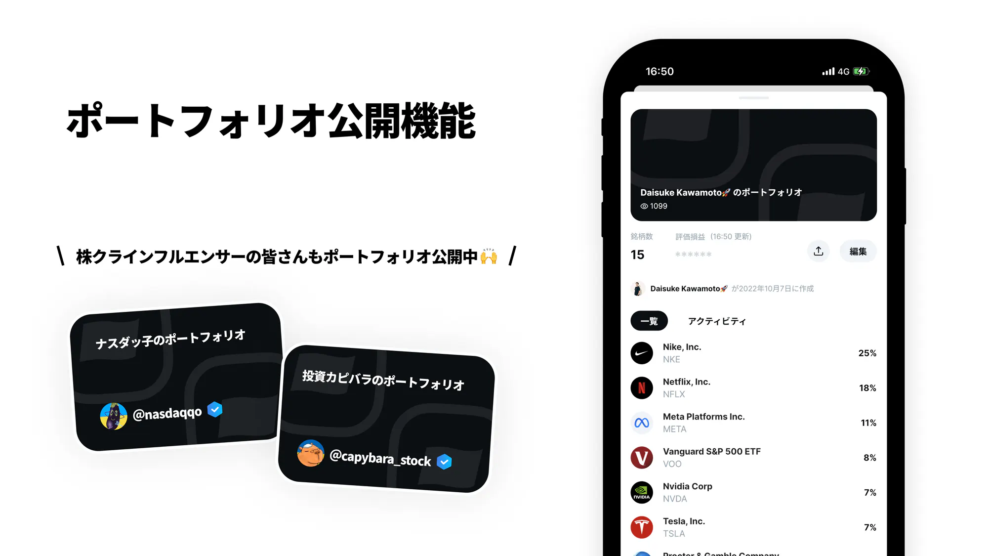 ユーザーが保有している銘柄やポートフォリオは別のユーザーにシェアできるほか、自分自身の資産もわかりやすく一覧できる。
