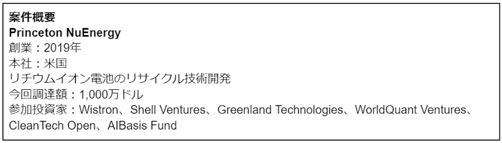 シードラウンドで1,000万ドルを調達したPrinceton NuEnergyはリチウムイオン電池のリサイクル技術を開発し、EV製造などリチウムイオン電池関連企業に対してライセンシングやコンサルを提供している、Princeton大学発の企業です。本案件は、同社が戦略提携を結んでいるWistron GreenTechの親会社Wistronが率いる形での調達となりました。