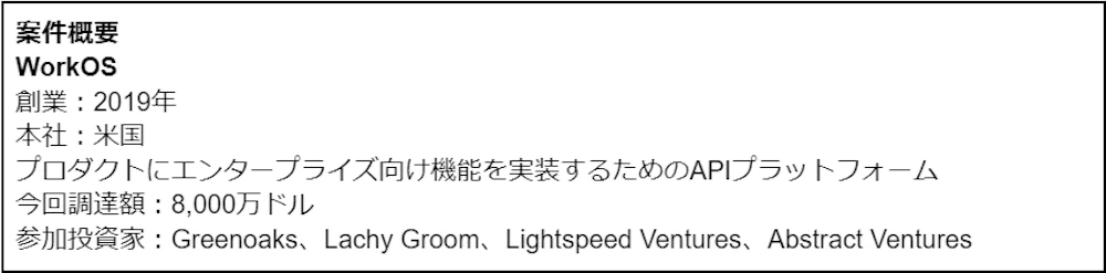 シリーズB1社目は、プロダクトマーケットフィット(PMF)後の企業のプロダクト開発を支援するAPIプラットフォーム、WorkOSです。同社は、Single Sign Onやディレクトリ同期、管理者ポータルといった、エンタープライズが導入するために求める機能を簡単に付加できるAPIを提供しています。エンタープライズは一般に、サービスの質やセキュリティへの要件が中小企業と比べて、厳しかったり導入までに検討時間を多く要したりと、サービスの導入の難易度は高いですが、導入に成功した場合は売上を大きく伸ばすことができます。したがって、PMFを完了した企業が成長していく上でエンタープライズが要望する機能を実装できているかは重要なポイントですが、同社はID管理関連やそのオンボーディングを中心に、こうしたエンタープライズ向け機能の実装を支援しています。
