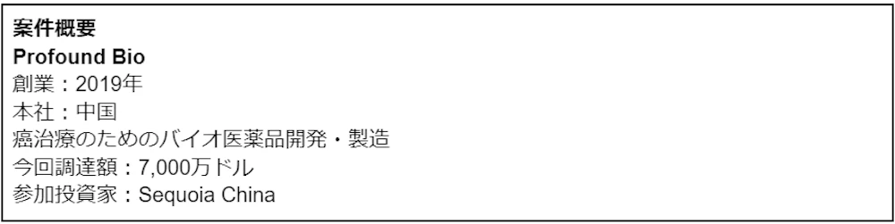 シリーズAのエクステンションラウンドで7,000万ドルを調達したのは中国で癌に対するバイオ治療薬の開発を進めるProfound Bioです。Profound Bioは、薬物を添加した抗体を使うことで、癌細胞にターゲットを絞り、薬物を届ける抗体-薬物複合体、癌細胞に結合する抗体とT細胞に結合する抗体の抗原認識部位をあわせもつT細胞エンゲージャー抗体により、免疫細胞を活性化するT細胞エンゲージャー、2つのアプローチを取っています。現在抱える10のパイプラインのうち、2つが前臨床開発段階であり、臨床試験に進めるための資金調達となります。