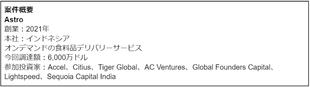 こうした環境の中、Astroは創業時より、ダークストア(ネット販売専用の物流センター)を活用して15分以内に食料品を配送するクイックコマースを標榜してきました。クイックコマースは、在庫や配送にコントロールを利かせる必要があることから、特に資本集約型のビジネスモデルとなる傾向にあり資金調達が重要ですが、2021年9月に創業した同社の本シリーズBラウンドではAccelやTiger Global、Sequoia Capital Indiaをはじめグローバルの著名投資家が参加して6,000万ドルの調達に至っています。