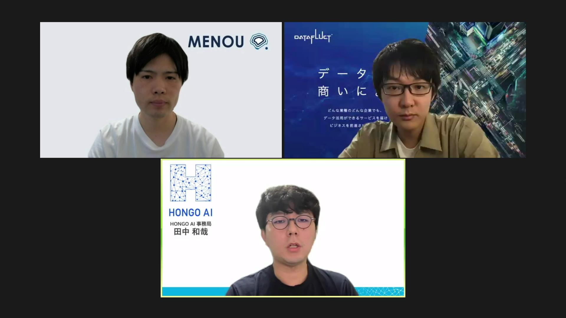 (左上)株式会社MENOU 代表取締役CEO 西本励照氏/(右上)株式会社DATAFLUCT 執行役員CTO/クロスファンクショナルユニット長 原田一樹氏/(下)HONGO AI ディレクター 田中和哉氏