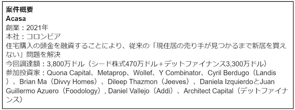 シードラウンドで、最も大きく資金調達したのはコロンビアの”Buy before you sell”モデルの不動産テックであるAcasaでした。Acasaはライフステージにあった住まいのニーズを支援すべく、不動産を売る前に購入できるよう、頭金融資&住宅ローンの提供を行っています。Quona Capitalが主導し、470万ドルの株式と、3,300万ドルのデット調達に成功しました。