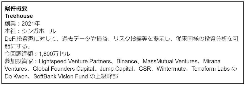 2番目に大きな調達となったのはDeFi投資家向けにデータ分析を提供するシンガポールのフィンテック企業Treehouseです。Treehouseはブロックチェーンのインデックス化、ユーザーのDeFiポジションの分析(過去データ、損益、リスク指標等)を提示し、伝統的な金融において投資家が行うのと同様なリスク分析等を可能にします。1,800万ドルのシード資金を複数の投資家から獲得しました。