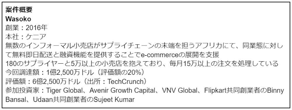 2番目はケニアのWasokoです。Wasokoはインフォーマルな小売店に即日配送・融資機能を提供し、eコマースを可能にするe-commerceイネーブラー企業です。従来の東アフリカ地域に加え(ケニア・タンザニア・ルワンダ・ウガンダ)、西アフリカ(コードジボワール・セネガル)での事業を開始しました。Wasokoは5万以上のインフォーマル小売りに対してサービスを提供し、これまで250万の注文を処理し、1年間で500%以上の収益成長に成功しています。