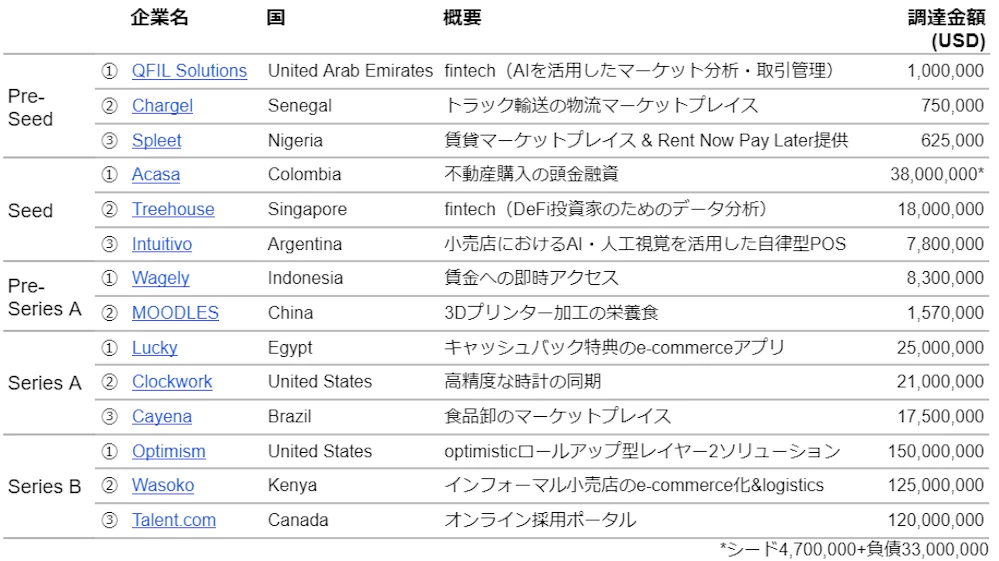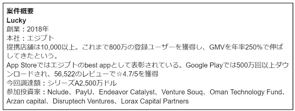 シリーズAで調達額が大きかったのは、エジプトのLuckyです。Luckyに加盟する店舗はLuckyのアプリ上で割引オファーやキャッシュバックを提供し、顧客のエンゲージを高めることができます。また、消費者はBNPLや分割払い等の決済を選択することが可能です。こちらはNcludeからの資金調達に成功していますが、このNcludeは、UAEを本拠とするMENA地域の現地VCであるGlobal Venturesおよびエジプトの大手銀行(Banque Misr、National Bank of Egypt、Banque du Caire)が組成したばかりのファンドとなり、同時にファイナンシャルスーパーアプリのKhazna、アグリフィンテックのMozare3、オンライン決済サービスのPaymobにも投資したことを明らかにしています。