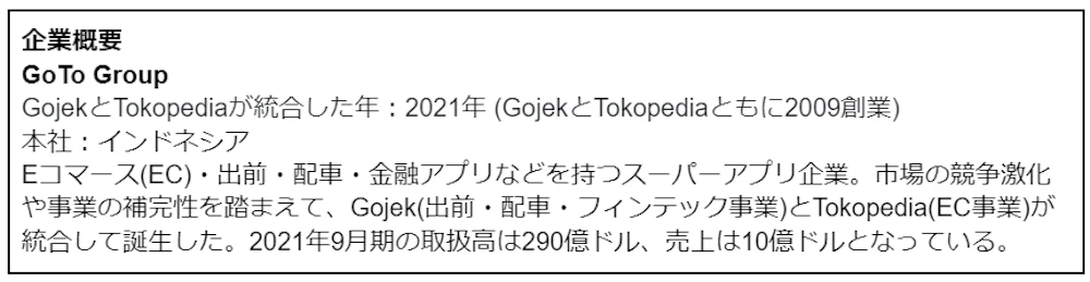 GoToのインドネシアにおける影響力は極めて大きい。EC業界では2番手(最大手Shopeeと拮抗)、配車アプリでも2番手(最大手Grabと拮抗)、決済アプリでは最大手(2番手のOVOが猛追)の立ち位置である。競合とのシェアの奪い合いは続くものの、インドネシア市場の成長を享受できる立場にある。