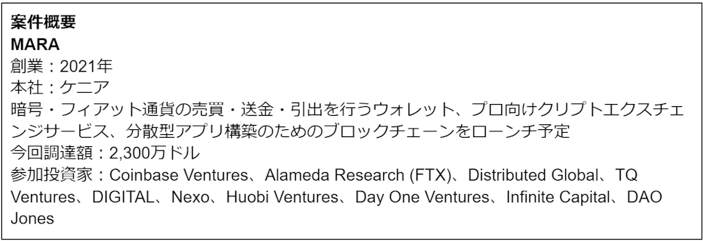 シードラウンドでCoinbase Venturesなど約100の投資家から2,300万ドルを調達したMARAはケニアに本拠地を置くクリプトプラットフォームです。今年7月にも暗号通貨・フィアット通貨の売買・送金・引出が可能な仲介アプリMARA Walletをナイジェリア・ケニアでローンチし、その後は分散型アプリ構築のためのレイヤー1ブロックチェーンであるMARA Chain、フル機能な取引・分析ツールを備えたPro-Exchangeを開発・運営することを予定しています。