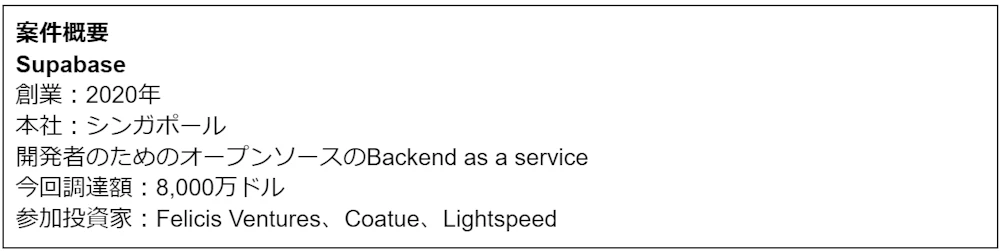 シリーズB1社目はGoogleのFirebaseに代わるオープンソース版のBackend-as-a-Serviceを運営する企業Supabaseです。同社はデータベースやストレージ、本人認証サービス、Function-as-a-Serviceといったプロダクト構築に必要なバックエンドサービスを提供しています。