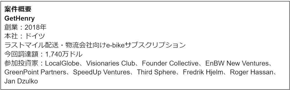 シードで1,740万ドルを調達したGetHenryはラストマイル配送・物流企業向けにe-bikeのサブスクリプション、ファイナンス、メンテナンス、車両管理ソフトウェアサービスを組み合わせたソリューションを提供しています。