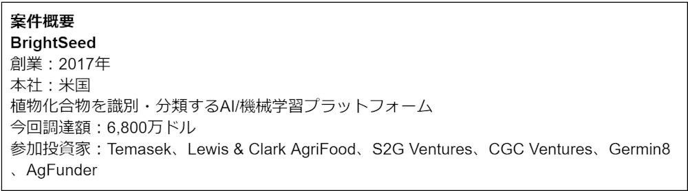 シリーズBで6,800万ドルを調達したBrightSeedは植物化合物をAIで識別・分類する分析プラットフォーム「Forager」を開発・運営しています。同社HPによると、これまで科学的に知られていた植物化合物は10万種類にすぎませんでしたが、Foragerはローンチ以来その10倍以上となる150万の植物化合物のマッピングを行ってきました。