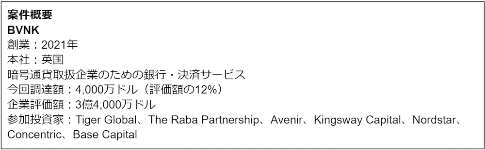 シリーズAで4,000万ドルを調達したのは暗号通貨を活用する企業のための銀行業務・決済サービスを提供するBVNKです。同社はクリプト通貨、法定通貨両方にまたがった銀行業務や決済のためのユニバーサルAPI、国際送金サービスを提供しており、次世代金融インフラの構築を目指しています。