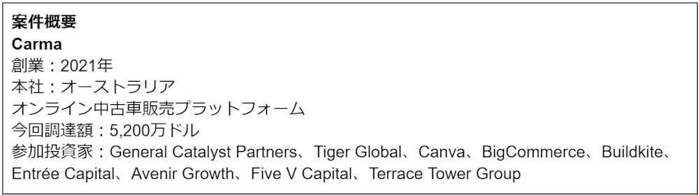シリーズAの調達で調達額が大きかったのはオンライン中古車販売プラットフォームを運営するCarmaです。Carmaは自身がオークションやディーラーなどから仕入れた中古車を完全オンラインで販売し、配送する会社であり、販売時にはカーファイナンスも提供しています。