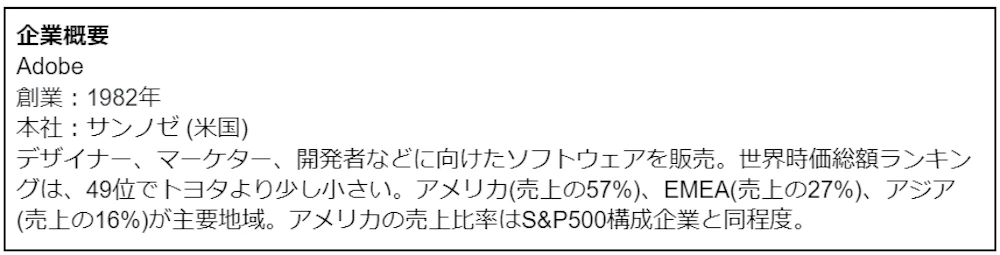 日本で上場している企業では、電子契約の弁護士ドットコムやExperience Cloudの類似製品を提供する米国のオラクルの子会社であるオラクルジャパンなどが部分的な競合といえるが、Adobeと直接競合する会社は少ない。システムインテグレーターが多い日本では、Adobeは競合というよりもパートナーと見るほうがよさそうだ。