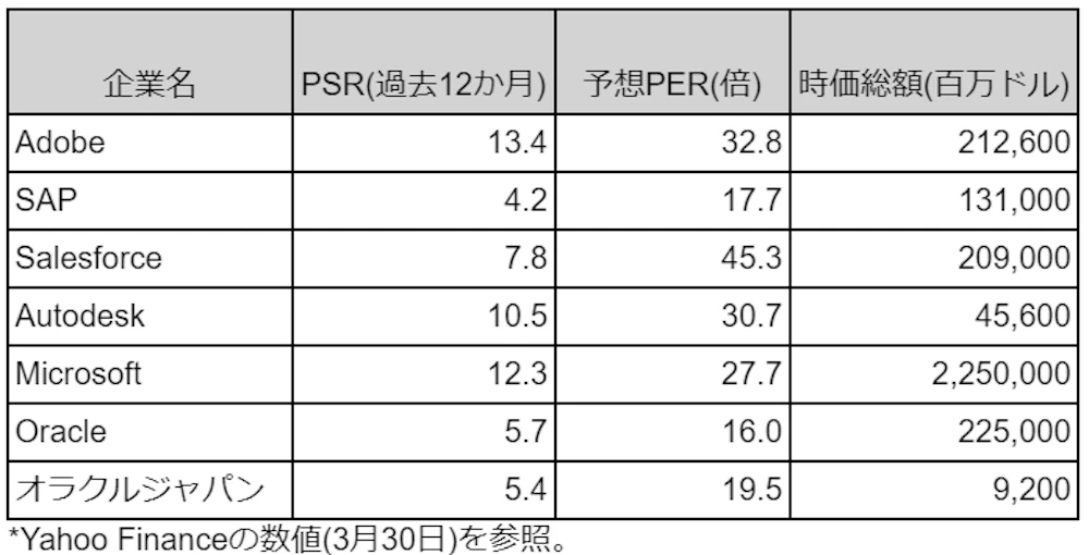 競合他社と比べて、Adobeは、バリェーションプレミアムがついており、人気な銘柄といえる。類似企業も規模が大きいため、売上成長率はスタートアップに比べて見劣りする一方、利益率が高い傾向にあるため、SaaS企業と比較した際には、PERにそれほど過熱感はない。