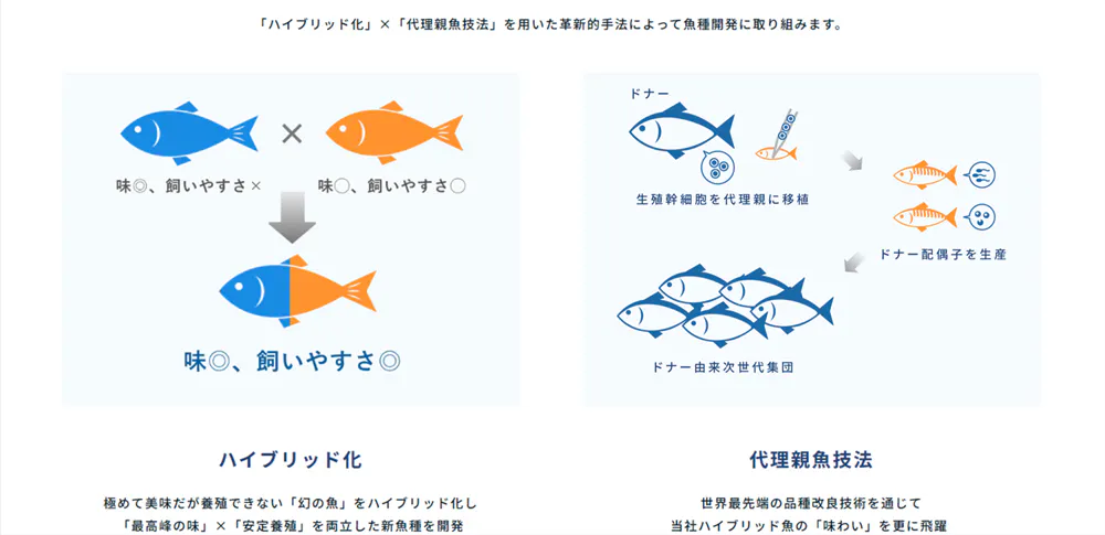 同社はこうした流通されていない魚のポテンシャルに目をつけ、「ハイブリッド化」と「代理親魚技法」を用いて、新たな魚食体験を提供する。味の良さや養殖のしやすさといった特性を持った二種類の魚を組み合わせるハイブリット化と、移植元の魚の生殖幹細胞を別の魚(代理親)の仔魚に移植することで、成熟した個体がドナー由来の次世代集団を作出する代理親魚技法により、これまで養殖が難しかった魚の安定的な生産に取り組んでいる。