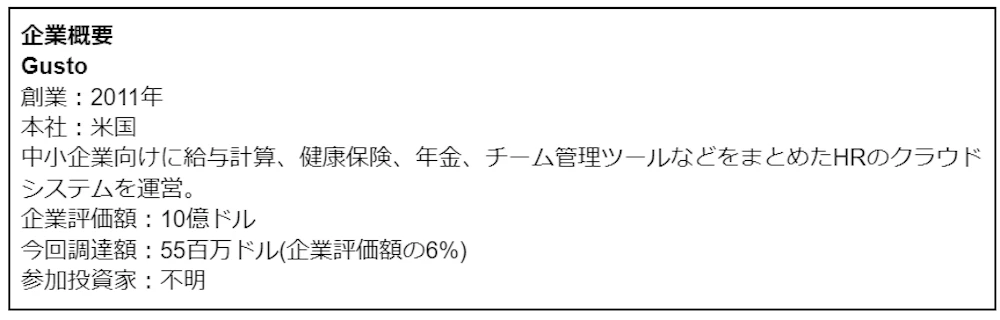第三位は、HRテックのGusto(資金調達額:10億ドル)です。上記の第二位で挙げたRipplingは、米国でも事業を展開しているため、同社の競合です。RipplingがGustoとの比較広告を出した際には、Gustoが広告の中止勧告書を出しました(※1)。Gustoの顧客は、従業員数が増えたタイミングでRipplingへの切り替えを検討することが多く(※2)、Gustoは10-50名程度の中小企業に強いといえそうです。複数のITサービスの統合をする上では、Ripplingの方が便利なため、使用するサービスが多い大企業では、Ripplingの方が使い勝手がよさそうです。