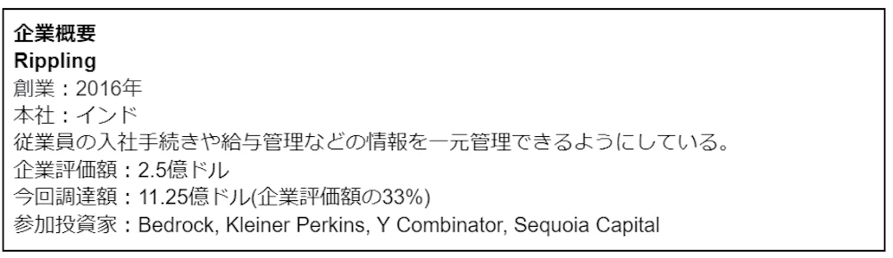 第二位は、HRテックのRippling(企業評価額 11.25億ドル)です。同社が最も力を入れているのが、別々のHR関連サービスの統合を進めることです。例えば、法人カードのBrexや従業員の身元調査を行うCheckrなど、企業はサービスごとに異なる企業に委託しているため、どうしても利用するHRサービスが増えてしまい、その管理が大変になっています。Ripplingは、従業員の同意を得た上で、同社のプラットフォームでそれらのサービスの統合を行っています。