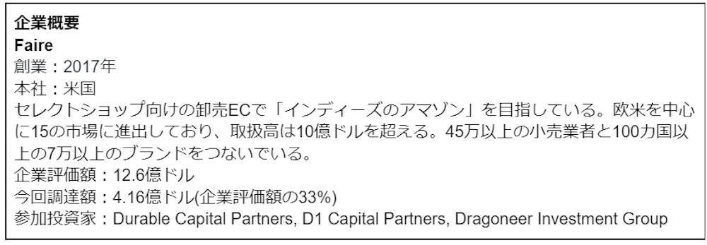 第一位は、セレクトショップ向けの卸売ECのFaire(企業評価額 12.6億ドル)です。同社のサイトでは、職人によるユニークな製品が多く、顧客であるセレクトショップはそれらを仕入れることによって、他の小売業者との差別化をはかっています。提供している製品やターゲットが若干異なるものの、卸売ECの競合ではMintedが挙げられます。アメリカのEC業界では、Amazonが強力なプレイヤーですが、Amazonが弱い領域をShopify(D2C)、Etsy(ハンドメイドに特化したBtoC)、Faireなどが補完しようとしています。