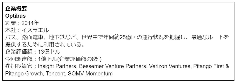 第二位は、公共交通機関の効率的な運行をAIで支援するOptibus(企業評価額 13億ドル)です。コロナの拡大によって公共交通機関の利用は減少しているため、一見すると同社のビジネスモデルは逆風にさらされているように見えます。しかし、構造的なトレンドとしてメガシティ(1,000万人以上の人口が居住する都市)の数は増加しており、そのような都市では公共交通機関の普及が必要不可欠です。一方で既存の公共交通機関のITシステムは古いため、同社のようなツールへの移行が求められます。