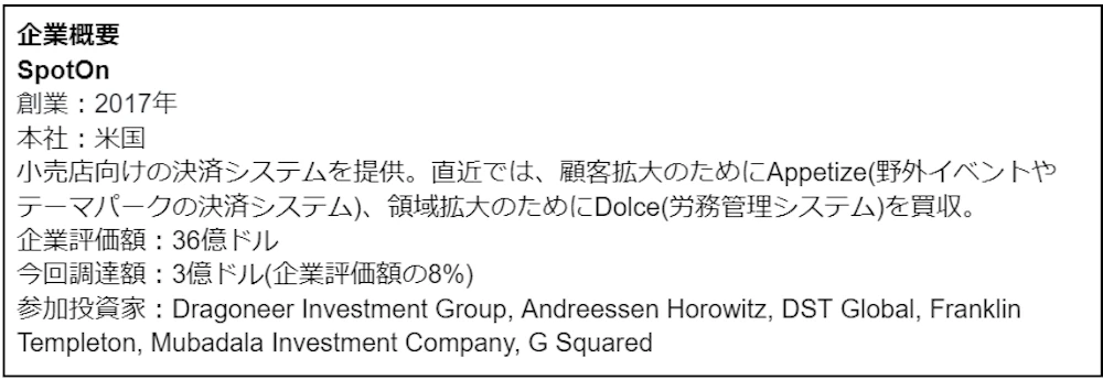 一方でSpotOnの評価額は、前回のシリーズEの資金調達からそれほど伸びませんでした。前回の増資と比べると5億ドル増で14%評価額が上昇しましたが、シリーズCからシリーズDで200%増、シリーズDからシリーズEで評価額が68%増加したことを踏まえると成長にブレーキがかかったように見えます。直近の株式相場の調整が影響した可能性があります。