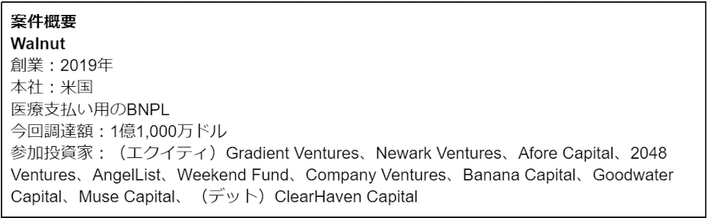 シリーズAの調達で調達額が大きかったのは医療費支払いのBNPLを手掛けるWalnutです。同社によると、アメリカでは毎年50万世帯が多額の医療費を理由に破産を宣告しており、3人に1人が医療費の負担を懸念し、医療を受けるのを控えているといいます。Walnutは医療費の大きな負担を緩和するため、POS型融資としてBNPLを展開することで医療を手の届くものにしています。