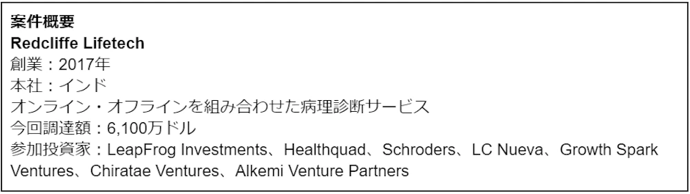 シリーズBで6,100億ドルを調達したRedcliffe Lifetechは病理診断サービスを展開しています。同社は、14都市に22の最新鋭ラボを有しており、オンラインチャネルと、100都市以上で在宅サンプル採取を行う高度な訓練を受けた400人の採血担当者、500の採取センターのオフラインネットワークを組み合わせてサービスを展開しています。従来の競合他社よりも25~60%安い非常に手頃な価格で3,500種類以上の病理検査や遺伝学などの専門的検査を提供できるようになっています。(※6)