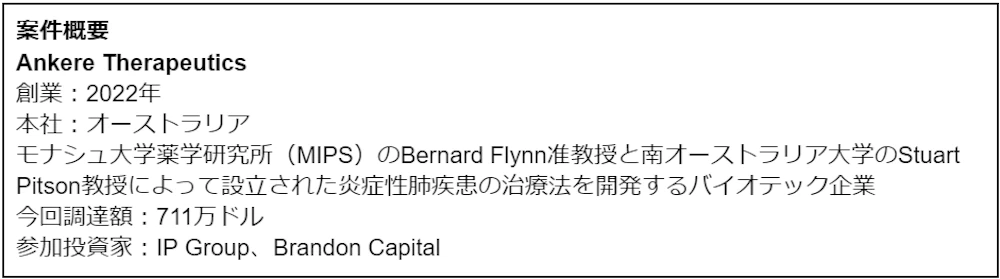 シードラウンドで711万ドルを調達したAnkere Therapeuticsは、独自の低分子科学に基づき、肺炎症疾患の新治療法を開発するバイオテクノロジー企業であり、本シードラウンドの調達とともにローンチされました。炎症性肺疾患は全世界で約5億5千万人がかかっているといわれ、喘息、慢性閉塞性肺疾患(COPD)、肺線維症、慢性・急性気管支炎、肺気腫、嚢胞性線維症などがあり、診断後3~5年と生存率が低いタイプもあります。(※1)なかには治療法が確立されていない疾患もあり、Ankere Therapeuticsは新たな治療法を開発することで肺疾患患者を支援します。