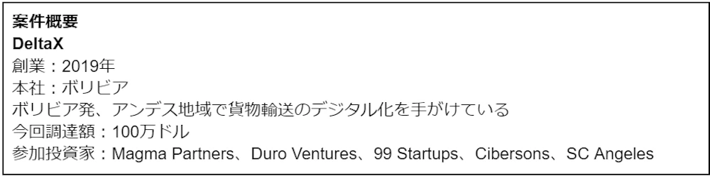 ボリビアのスタートアップエコシステムは未だ黎明期にあり、Crunchbase上で確認できる資金調達は2021年に5件、2020年以前は年1件にとどまっています。ボリビアには法的根拠がないためにアクティブなVCファンドが存在せず、多くのスタートアップがVCファンドへのアクセスが限られている状況です。こうした困難な環境下で今回調達を行ったDeltaXは貨物輸送のプラットフォームであり、チリのMagma Partnersが調達を主導しています。同様の領域でサービスを展開している企業にはユニコーン企業であるConvoyやLoadsmart、Sennder等がありますが、DeltaXはアンデス地域に特化しています。