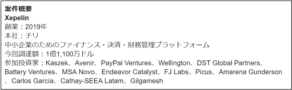シリーズB1社目は1億1,100万ドルを調達したB2Bフィンテック企業のXepelinです。Xepelinのプラットフォーム上で、中小企業は請求書の支払い指定、ビジネスの収入、支出、買掛金の管理、キャッシュフローの予測といったリアルタイムの財務情報管理ができるとともに、融資を受けることが可能です。