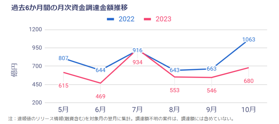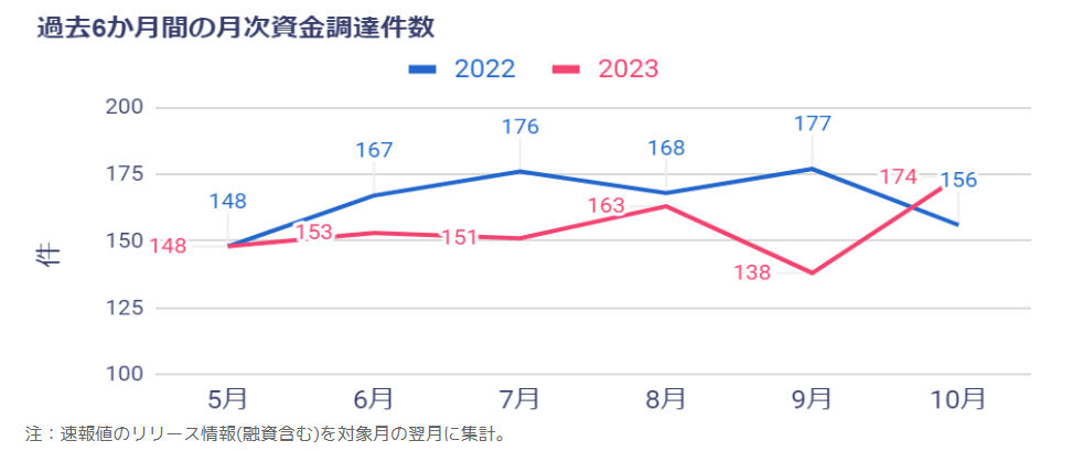 2022年10月は、2件の大型調達(UPSIDERの467億円の融資、自然電力の200億円の転換社債型新株予約権付社債)があり、前年同月比のハードルが高かったといえる。2023年9月に2件あった100億円を超える調達がなかったにも関わらず、2か月ぶりの増加に転じている。中小型案件が調達総額を押し上げており、スタートアップ市場にとって明るい材料である。