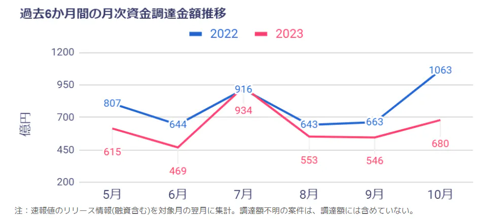 調達件数は、過去6か月で最多となった。また、過去6か月間で初めて前年同月比がプラスに転換した。小型案件や調達額不明の案件が下支えとなっている。これらの案件は、グロース市場の低迷や金利上昇などのマイナス影響を受けにくかったと考えられる。