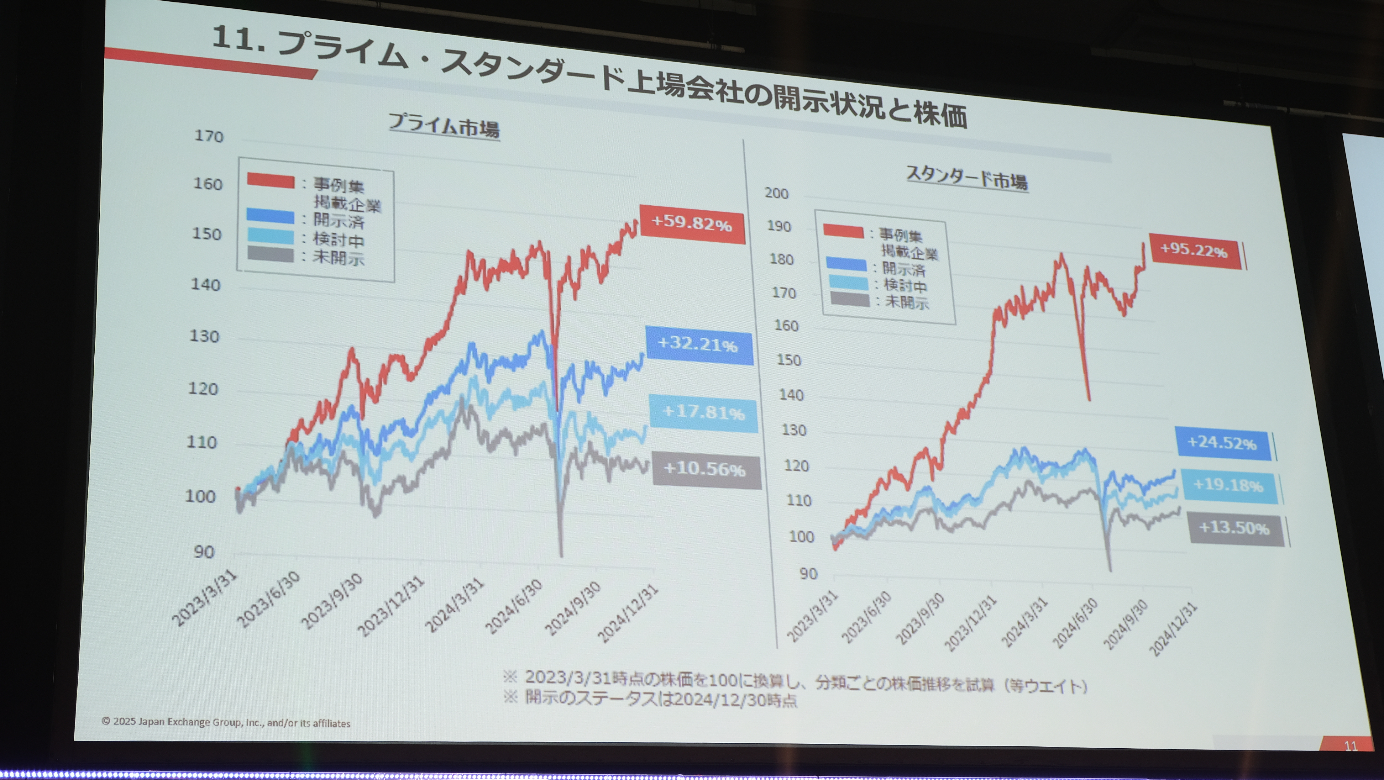 岩永氏:こちらは、タイトルにもありますが、プライムとスタンダードの会社のパフォーマンスを示したものですが、先ほども申しました、巷で言われているいわゆるPBR(株価純資産倍率)要請は行っておらず、「資本コストとか株価を意識した経営をしてください、そのために株主や投資家に対して将来的にどういう経営をやっていくかを明示して開示してください」というお願いをしました。プライムはもう9割、当初関係ないと思っていたスタンダードの会社も5割ぐらい開示をしていただいています。